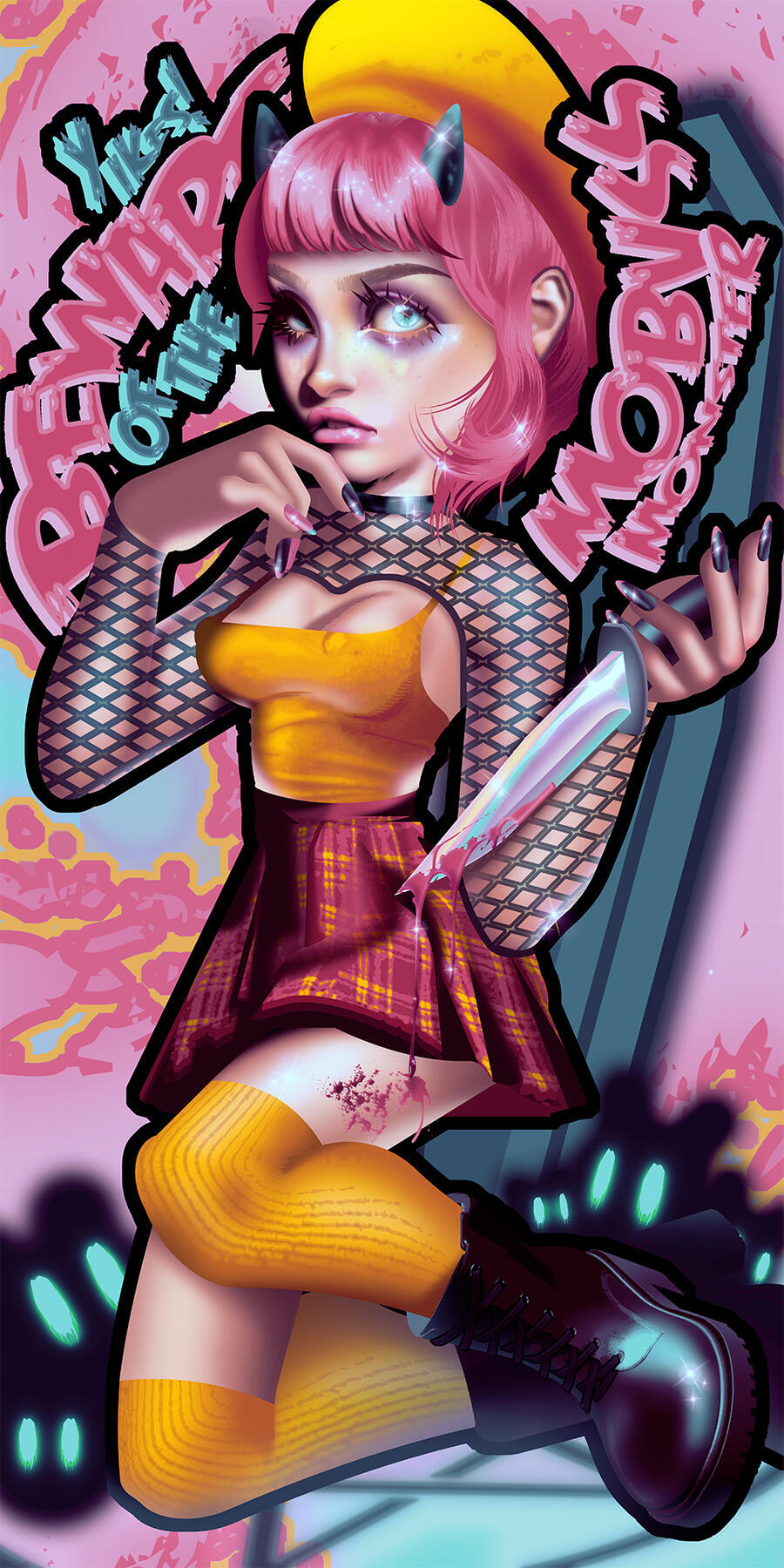 Marie is a digital and traditional artist building feminine and erotic spaces where glitter alchemizes grit into audacious, unapologetic self-expression. A walking contradiction, her work thrives in tension and contrast; bold tones softening into bloom, shimmer fractures rigid edges. Guided by music, each piece leans toward controlled fires or drifts into untamed hush. Through every shift, her art retains its unmistakable pulse.Drawn to the contours of women, Marie builds much of her work around sensuality and resilience. Raised on subgenres of rock’s defiant spirit and the “girls to the front” ethos, her work celebrates empowerment while navigating the space where it intersects with vulnerability in a world that constantly objectifies female bodies. Fueled by aggression and anguish, her commentary on societal expectations gives the work its polished yet raw atmosphere.Her work bursts with fluorescent, neon colors and punchy, high-contrast graphics, rooted in retro digital culture and draped in heavy cast shadows inspired by film noir. Grindhouse cinema and pulp magazines inform many of her choices, while scribbles in the shadows and four-point stars in the highlights quietly mark her hand. Drawing since childhood, she learned to turn perfectionism and doubt into creative fuel, letting tension and restraint pulse through her artistic rhythm.Opposition is rarely met without friction. Depression has been both catalyst and barrier in Marie’s journey, and art remains the way she translates her soul into visual form. She wants viewers to fall into fantasy and feel the electric frenzy of pieces like MOBVSS Monster or La Diabla, while encountering the quiet hardships of mental illness within her Melancholic series. As she grows, Marie hopes to expand into promotional opportunities and future exhibits. Above all, she wants her work to live in the world and invite others into the way she sees and feels.